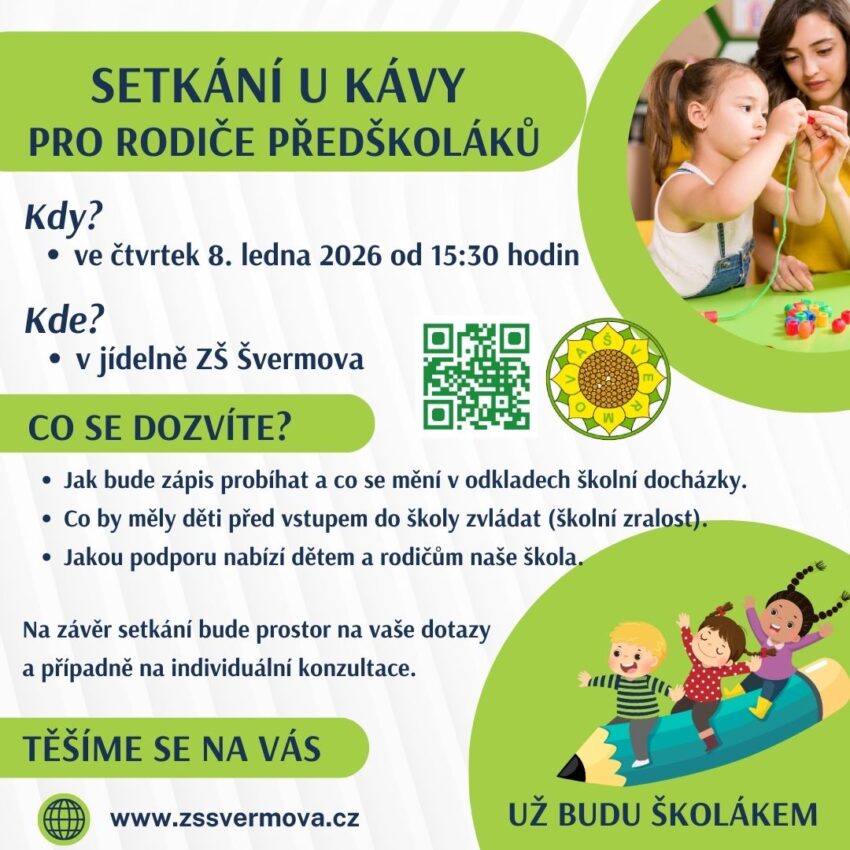 ZŠ Švermova zve rodiče předškoláků na setkání u kávy. To se uskuteční 8. ledna 2026 od 15:30 v jídelně školy. Dozvíte se zde vše potřebné, co potřebujete vědět před nástupem vaší ratolesti do školy.