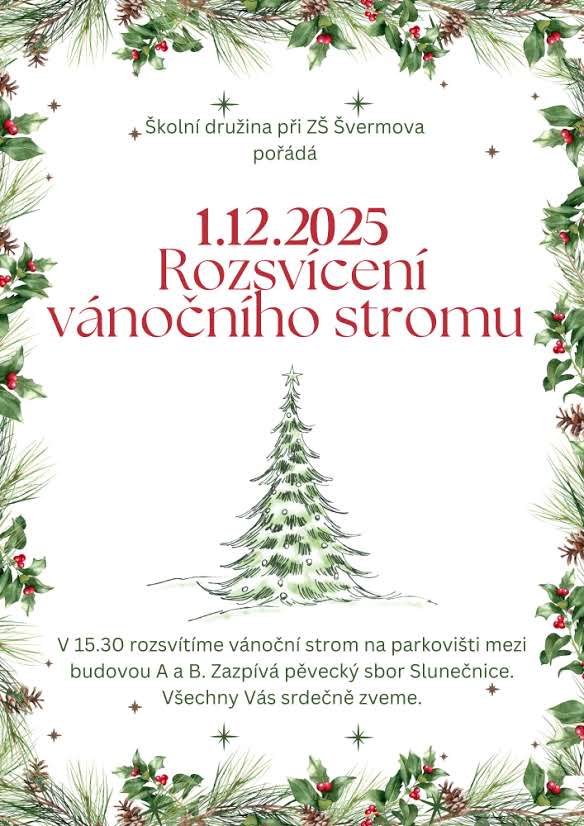 ZŠ Švermova vás zve v pondělí 1.12. od 15:30 na společné setkání u školního vánočního stromku (mezi budovami A a B). Čeká vás krátké vystoupení pěveckého sboru Slunečnice a rozsvícení stromku.